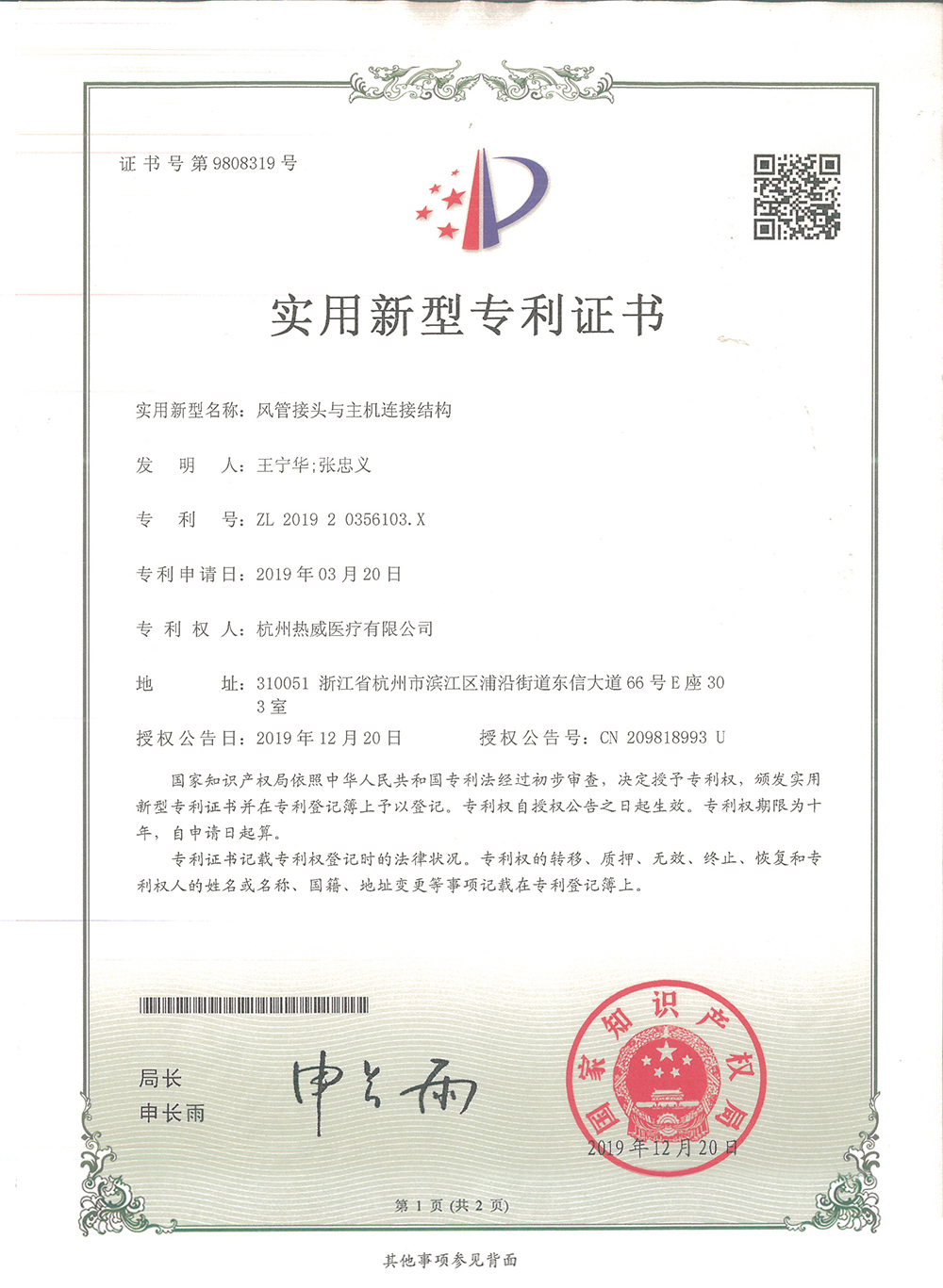 实用新型专利证书(签章)一种输液测速防水结构